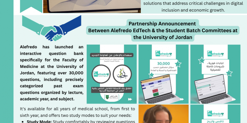 Alefredo has launched an interactive question bank specifically for the Faculty of Medicine at the University of Jordan, featuring over 30,000 questions, including precisely categorized past exam questions organized by lecture, academic year, and subject.